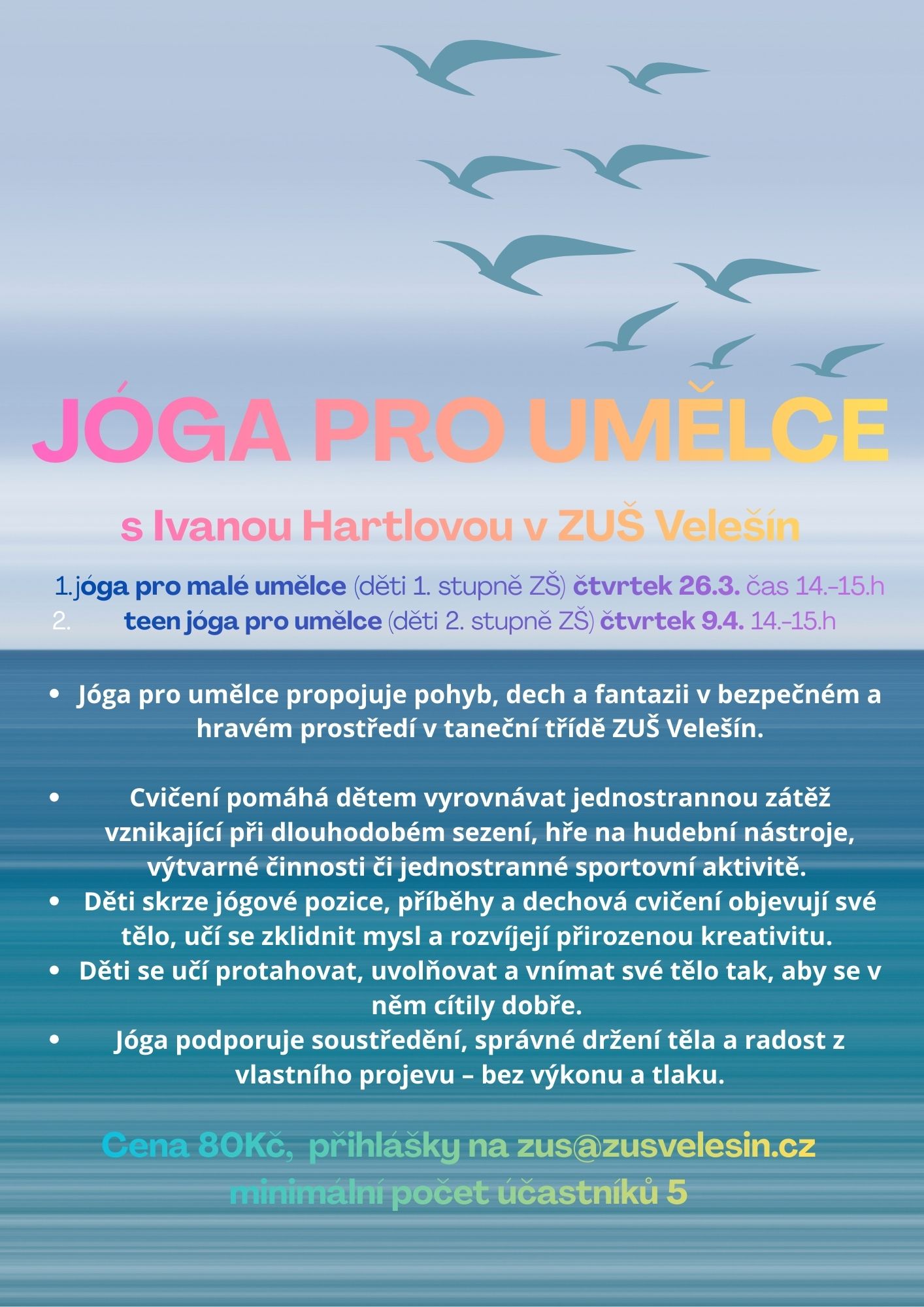 Srdečně zveme žáky ZUŠ Velešín na lekci jógy pro umělce s Ivanou Hartlovou.